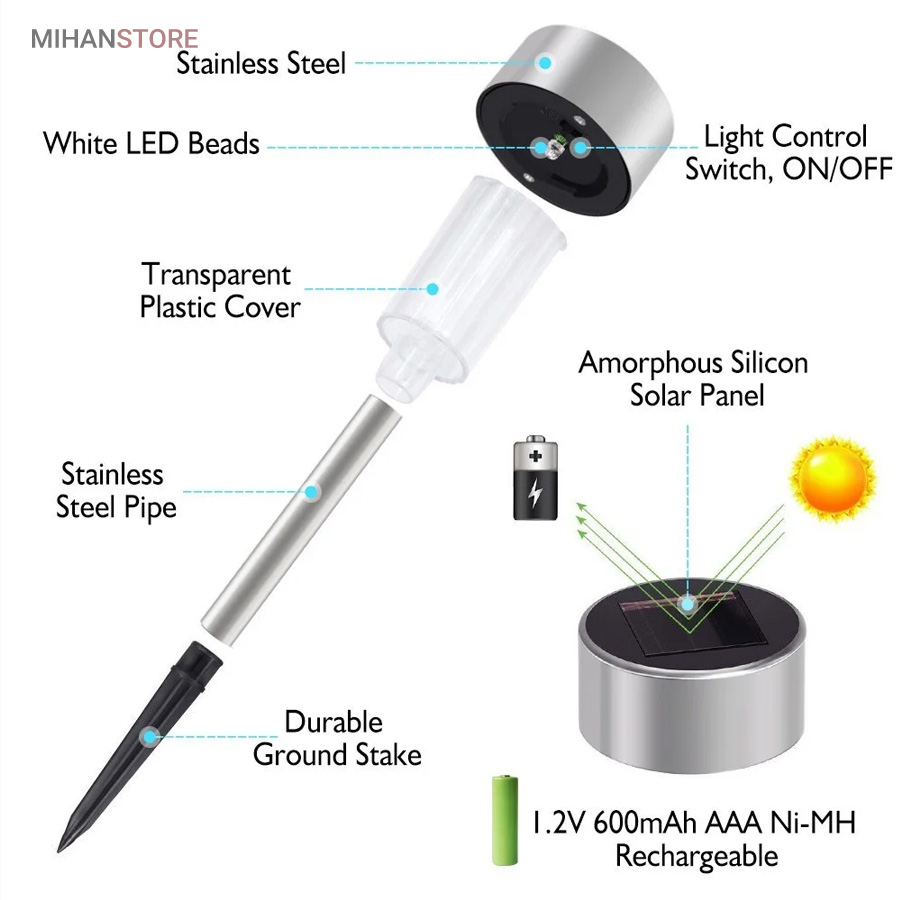 چراغ های خورشیدی با توجه به عدم نیار به سیم کشی و ضد آب بودن برای باغ ها و حیاط ها و ویلا ها بسیار مناسب میباشد. این محصول با پنل خورشیدی 4 سانتی متری خود در طول روز باتری داخلی را شارژ میکند و در هنگام تاریکی به صورت خودکار و اتوماتیک لامپ ال ای دی خود را روشن میکند تا به محیط شما نور و زیبایی ببخشد. چراغ خورشیدی قلمی با ابعاد کل 6 * 35 سانتی متر از نوع باغی باغچه ای و نحوه نصب آن به صورت کاشتنی میباشد. این چراغ دارای باتری از نوع باتری شارژی قلمی سولونیکس مدل صنعتی Ni-Cd است که جز قوی ترین باطری های بازار است. همچنین محصول دارای کلید کنترل روشن و خاموش دستی و اتوماتیک میباشد.